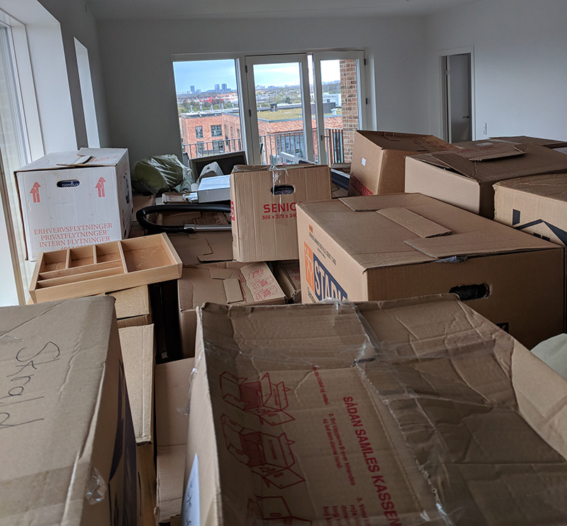 Men på mystisk vis gik det faktisk rigtig fint. Vi fik relativt hurtigt tømt den første flyttebil. Anden bil ankom, og alle mand hjalp til med at få de eeeenoooorme mængder kasser med Lars bøger op. Der opstod almindelig trafikkaos ved elevatoren, hvilket helt sikkert var den største årsag til forsinkelse på dagen. Men op kom det hele. Åh, den følelse af at lukke døren efter sidste flyttemand – og så bare være her!